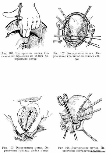 1. Какова техника первых этапов экстирпации матки без придатков? Первые этапы экстирпации матки сводятся к вскрытию брюшной полости, выведению матки с придатками в рану, наложению зажимов на круглые, собственные связки яичников и маточные трубы с обеих сторон, затем их пересечению и лигированию культей. В поперечном направлении (между культями круглых связок) вскрывают брюшину в области пузырно-маточной складки. Мочевой пузырь частично острым, частично тупым путем отслаивают книзу до уровня переднего свода влагалища. До этого момента все перечисленные этапы выполняют аналогично тому, как это делается при надвлагалищной ампутации матки. С этого момента экстирпация по технике выполнения будет существенно отличаться от ампутации. 2. Как производится отделение связок и брюшины от матки? Следующий этап заключается в том, что матку максимально приподнимают кпереди и производят разрез брюшины, покрывающей заднюю поверхность надвлагалищной части шейки над местом прикрепления крестцово-маточных связок. Брюшина тупо отслаивается пальцем или тупфером до границы влагалищной части шейки матки (рис. 101). После отделения брюшины от шейки матки сзади накладываются зажимы на крестцово-маточные связки с обеих сторон, последние пересекаются и лигируются кетгутовыми лигатурами (рис. 102). 3. Какова техника перевязки сосудистых пучков? Для перевязки маточных артерий отводят книзу брюшину по ребрам матки, доводя ее до уровня влагалищных сводов, что определяют по разнице (ощущение «порога») в месте перехода шейки во влагалище (рис. 103). Несколько ниже внутреннего маточного зева, отступя кнаружи, накладываются зажимы на сосудистые пучки с обеих сторон, выше накладываются контрклеммы. Сосудистые пучки между зажимами пересекаются и несколько отодвигаются книзу и латерально, чтобы не мешать последующему удалению матки, и затем перевязываются кетгутом (рис.104). ![]() Нижние отделы матки освобождают от окружающих тканей путем отслаивания их за пределы шейки матки. 4. Какова техника отсечения матки от стенок влагалища? После перевязки сосудов и освобождения матки от окружающих тканей передний влагалищный свод захватывается зажимом, приподнимается кверху и вскрывается ножницам» (рис. 105). В разрез вводят марлевую полоску, смоченную йодом, и пинцетом проводят ее во влагалище. Через образованное отверстие по влагалищным сводам накладывают зажимы, при этом предварительно влагалищную порцию шейки матки захватывают щипцами Мюзо и выводят последнюю через разрез в рану, после чего отсекают матку от влагалищных сводов выше наложенных зажимов (рис. 106). Зажимы, оставшиеся на культе влагалища, заменяются кетгутовыми лигатурами. ![]() Культя влагалища зашивается отдельными кетгутовыми швами, при этом просвет влагалища можно закрыть полностью или оставить открытым. 5. В каких случаях влагалище зашивают наглухо и когда оставляют открытым? Влагалище зашивают наглухо, если операция прошла чисто. Влагалище оставляют открытым в тех случаях, когда необходимо обеспечить отток из параметральных отделов, если операция производилась в заведомо инфицированных условиях. Оставшаяся открытой верхняя часть влагалища выполняет роль кольпотомического отверстия и обеспечивает так называемое бестампонное дренирование. Для этого зашивание влагалищной культи производ