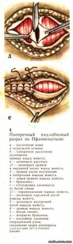 Положение больной на операционном столе такое же, как и при выполнении срединного продольного разреза; так же дезинфицируют кожу живота. При изоляции операционного поля стерильными простынями для разреза оставляют неприкрытой поперечную полосу кожи над лобком. Следует признать, что швы прочнее удерживаются на поперечном разрезе, поэтому после него реже наблюдается расхождение краев раны. При поперечном разрезе никогда не происходит эвентрация, которая нередко возникает при расхождении краев срединного продольного разреза. Несомненным преимуществом этого способа вскрытия брюшной полости является и то, что он менее заметен, если разрез проходит как раз по надлобковой складке. Однако наряду с этим надо признать, что при разрезе по Пфанненштилю наблюдается кровоточивость тканей, операционное поле при этом обозревается значительно хуже; доступ к органам малого таза и выполнение операции могут быть затруднены; в ходе операции (если это необходимо) поперечный разрез невозможно увеличить; наконец, отрицательным является то, что в послеоперационный период иногда наблюдаются подфасциальные гематомы. Кожу и подкожную основу рассекают по надлобковой складке на расстоянии 2—3 см от верхнего края лобкового симфиза (рис. 4, а); кровоточащие сосуды (особенно поверхностные надчревные артерии, проходящие с обеих сторон в паховых областях) следует сразу же пережимать зажимами и тщательно перевязывать. Апоневроз надрезают скальпелем с обеих сторон от белой линии, на всем остальном протяжении раны его рассекают изогнутыми ножницами (рис. 4, б, в). Край раны посередине апоневроза захватывают тугим зажимом Кохера и, сильно оттягивая кверху, отсекают его ножницами от белой линии по направлению к пупку, насколько позволяет величина разреза кожи (рис. 4, г). При отслойке апоневроза от мышц живота может быть ранена нижняя надчревная артерия или одна из ее ветвей, которую следует заблаговременно пережать зажимом, после чего перерезать и перевязать. Если ранение этой артерии остается незамеченным, кровотечение во время операции из нее может остановиться, а в послеоперационный период возобновиться и послужить источником образования обширной подфасциальной гематомы. При разрезе по Пфанненштилю обычно рассекают не только листки апоневроза, составляющие переднюю стенку влагалища прямых мышц живота, но и сухожилия наружных и внутренних косых, а также поперечной мышц живота. Но ни одну из мыщц передней стенки живота не следует разрезать. Левую прямую мышцу, как и при срединном прямом разрезе, отсепаровывают, а затем отодвигают от белой линии в сторону, после чего вскрывают брюшину между двумя анатомическими пинцетами (рис. 4, д) и прикрепляют к салфеткам, которыми дополнительно обкладывают рану. Рану раздвигают ранорасширителями. При наличии сращений органов малого таза, плохой их подвижности или большом размере опухоли разрез брюшной стенки по Пфанненштилю нерационален. Брюшину зашивают непрерывным кетгутовым швом по направлению от пупка к лобковому симфизу; той же нитью, возвращаясь от лобкового симфиза к пупку, подшивают левую прямую мышцу к белой линии или сшивают внутренние края обеих прямых мышц живота. Апоневроз сшивают узловатыми кетгутовыми швами, после чего прошивают подкожную основу также узловатыми кетгутовыми швами, однов