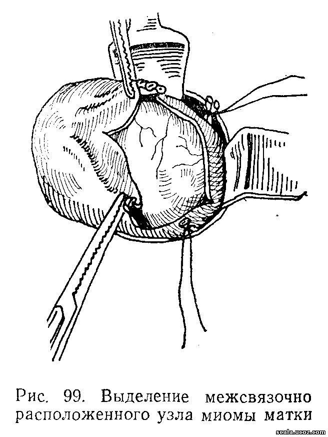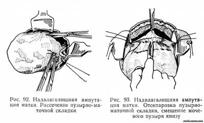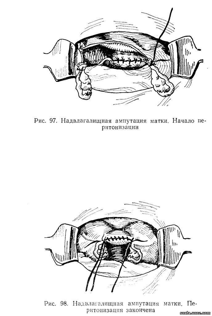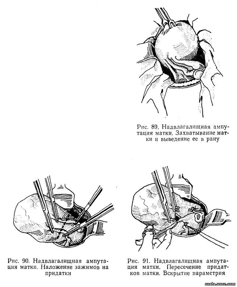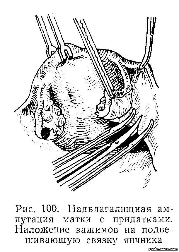 К группе радикальных операций относятся такие хирургические вмешательства, при которых удаляют всю матку или большую ее часть. Женщина, перенесшая такую операцию, лишается детородной и менструальной функций. 1. Какие операции относятся к радикальным? К радикальным операциям относятся: а) надвлагалищная ампутация матки без придатков или с придатками; б) экстирпация матки без придатков или с придатками. 2. Что является показанием к этим операциям? Эти операции производят преимущественно у женщин в климактерическом периоде и во время менопаузы. Иногда их производят и у более молодых женщин, если опухоль вызывает обильное кровотечение и другие симптомы, имеет большие размеры (превышает объем матки в 12 нед беременности) или же имеются признаки, заставляющие заподозрить злокачественное перерождение опухоли (быстрый рост, размягчение и др.) Если узлы миомы расположены только в теле матки, а шейка патологически не изменена, производится надвлагалищная ампутация матки (на уровне внутреннего зева). Если узел расположен в шейке матки или на последней обнаруживаются старые разрывы, гипертрофия, деформация, эктропион, эрозия, полипы, то производят полную экстирпацию матки. Вопрос о придатках решается во время операции. Если они патологически изменены, то производится удаление матки с придатками. 3. Каковы основные этапы операции над влагалищной ампутации матки без придатков? Основные этапы операции надвлагалищной ампутации матки без придатков следующие: а) лапаротомия нижнесрединная или по Пфанненштилю; б) мобилизация матки (отсечение от матки маточных труб, собственных связок яичников и круглых маточных связок); в) вскрытие брюшины пузырно-маточной складки, отсепаровка мочевого пузыря, прилегающего к шейке, и обнажение с обеих сторон маточных сосудов (артерий и вен); г) клеммирование, перерезка и перевязка маточных сосудов с обеих сторон; д) отселение тела матки; е) зашивание культи шейки матки; з) перитонизация; ж) зашивание передней брюшной стенки. 4. Каковы первые этапы операции на матке? По вскрытии брюшной полости вводятся расширяющие рану зеркала, органы брюшной полости отграничиваются салфетками, затем производится осмотр матки и придатков и намечается объем оперативного вмешательства. Щипцами Мюзо матка захватывается за дно и выводится за пределы раны. В ряде случаев для выведения матки можно использовать специальный штопор (рис. 89). 5. Что необходимо учесть при выведении матки в рану? Перед выведением матки в рану необходимо убедиться в том, что нет сращений матки с кишечником и сальником. Если таковые имеют место, выведение матки должно предшествовать разделение сращений. 6. Каков дальнейший ход операции? После выведения матки на маточные трубы, на собственные связки яичников и круглые маточные связки с обеих сторон накладываются зажимы Кохера, отступя на 2—3 см от матки. Контрклеммы накладываются на уровне самой матки (рис. 90). Затем труба и связки пересекаются между зажимами и ножницами рассекается соединяющий их мостик брюшины (рис. 91). За лигатуры придатки оттягиваются в сторону и марлевым тупфером края раны разводятся по направлению к шейке. ![]() 7. Как производится рассечение пузырно-маточной складки брюшины? За лигатуры круглые маточные связки оттягиваются в стороны и между ними в поперечном направлении производит